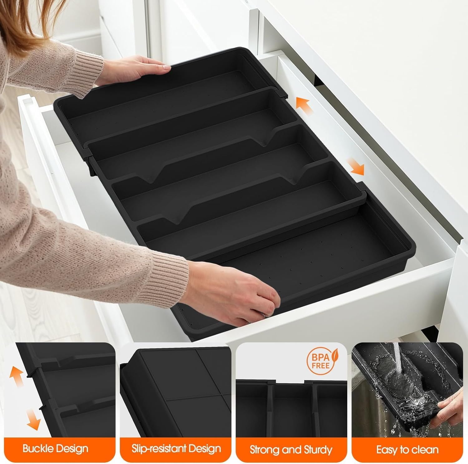 Large Silverware Organizer, Expandable Utensil Drawer Organizer for Kitchen Drawers, Kitchen Drawer Organizer for Spoons/Forks/Knives, Multipurpose & BPA Free Cutlery Tray, Black, 1 Pack
