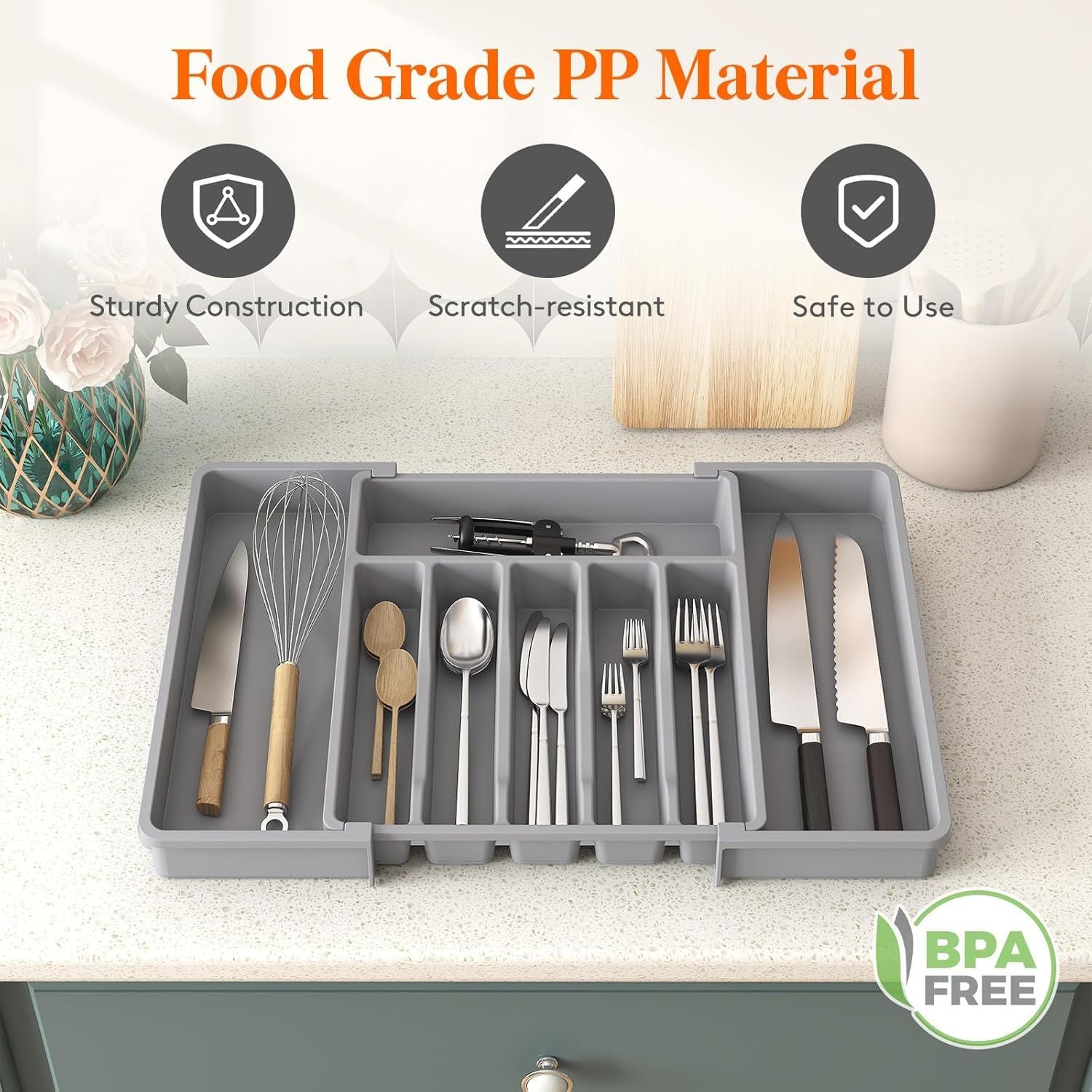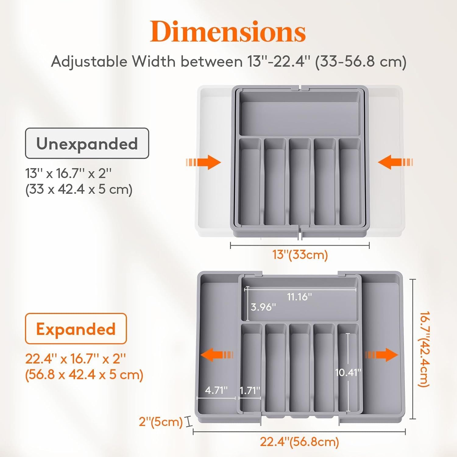 Silverware Drawer Organizer, Expandable Utensil Tray for Kitchen, BPA Free Flatware and Cutlery Holder, Adjustable Plastic Storage for Spoons Forks Knives, 33 -57 x 42cm, Gray