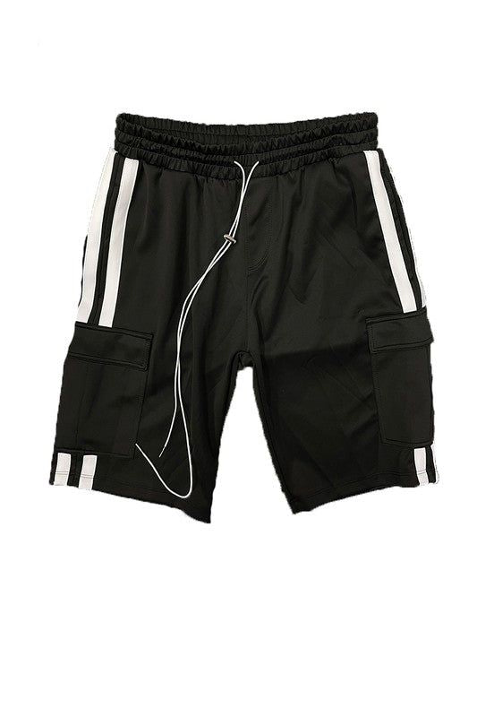 Details Two Stripe Cargo Track ShortElastic Waist with DrawstringRegular FitStandard PocketsTwo Back Pockets with Velcro ClosureSide Cargo Pockets with Velcro... Read more
