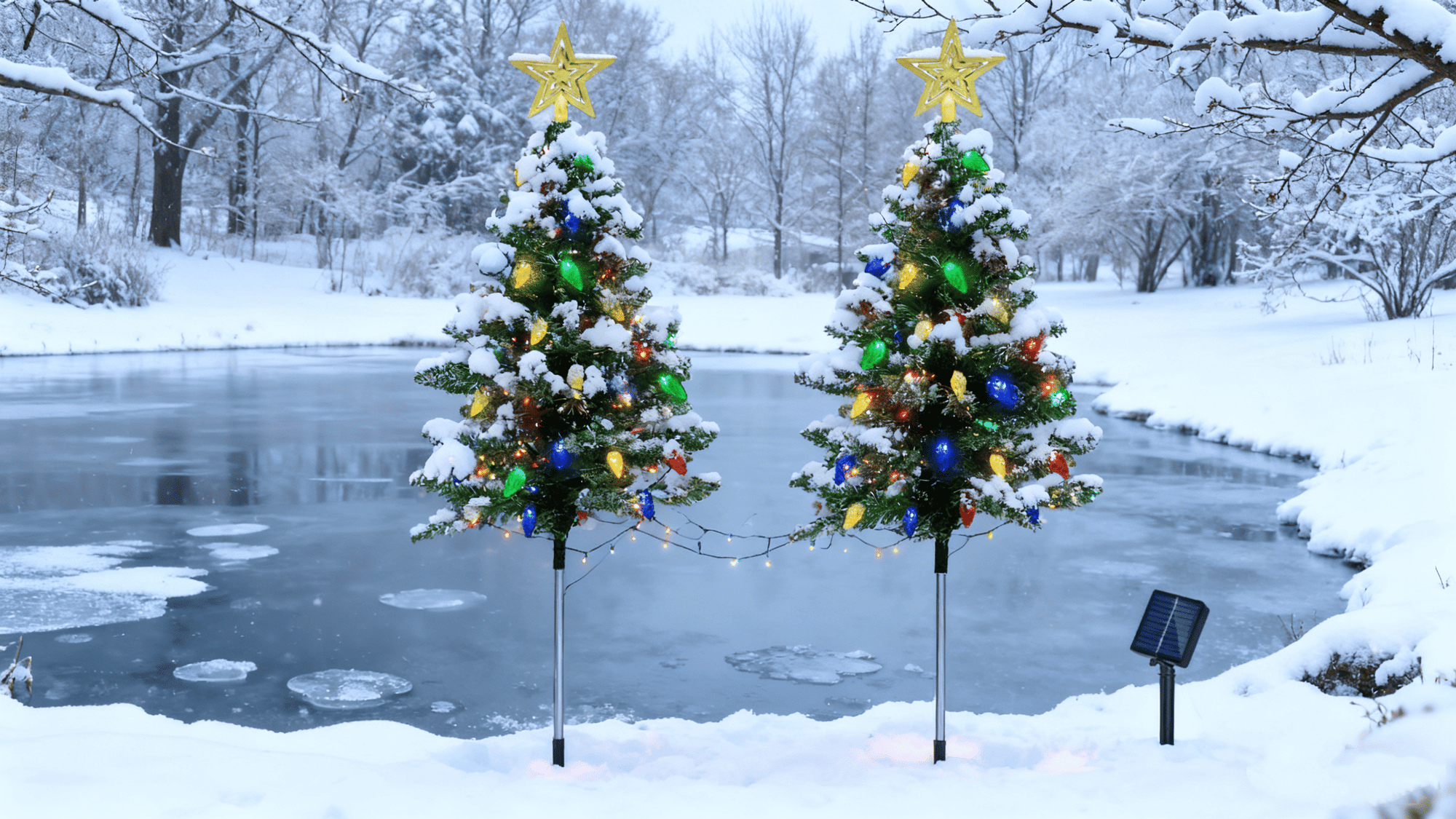 Exquisite Tree Lights With Christmas Ornaments: 2Pack solar-powered Christmas tree lights(each height is about 37.4in) imitate real pine tree, creating a realistic and rich holiday atmosphere. Adorned with a variety of cute and gorgeous accessories, including stars, bows, bells, and vibrant colorful balls, allowing for customizable decoration to suit personal taste.